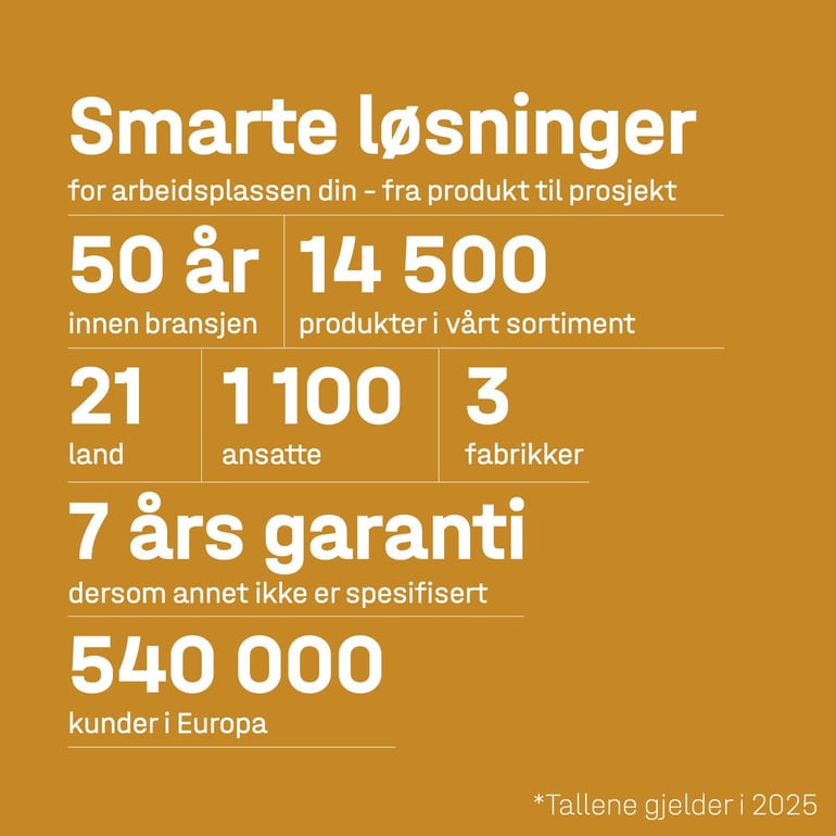 Sortimentet består av møbler, utstyr og interiørløsninger som gjør det bedre og morsommere å gå på jobb. Til sammen nesten 15 000 produkter til kontor, skole, lager, industri og garderober – alt lett tilgjengelig via e-handel, katalog, tilpassede prosjekter eller telefonsamtale med en av våre selgere.