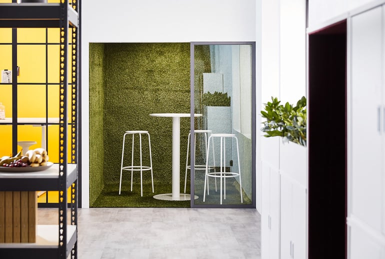 Den fjerde og siste sonen besto av et stillerom satt av til individuelt arbeid, viktige telefonsamtaler eller samtaler mellom fire øyne. Det kunstige gresset på veggene var ikke bare et artig innslag, det bidro også til lyddemping, i tillegg til at den grønne fargen er beroligende. Flere av de ansatte brukte stillerommet når de ønsket å jobbe uforstyrret.– Først satte jeg meg ved et vanlig bord, fordi jeg er vant til det, sier Lars Sörqvist, deleier og planlegger. Men da stillerommet ble ledig gikk jeg inn. Det var hyggelig å sitte der for seg selv og skrive litt. Den lille størrelsen på rommet var perfekt. Generelt likte jeg å kunne bytte mellom ulike miljøer etter behov.