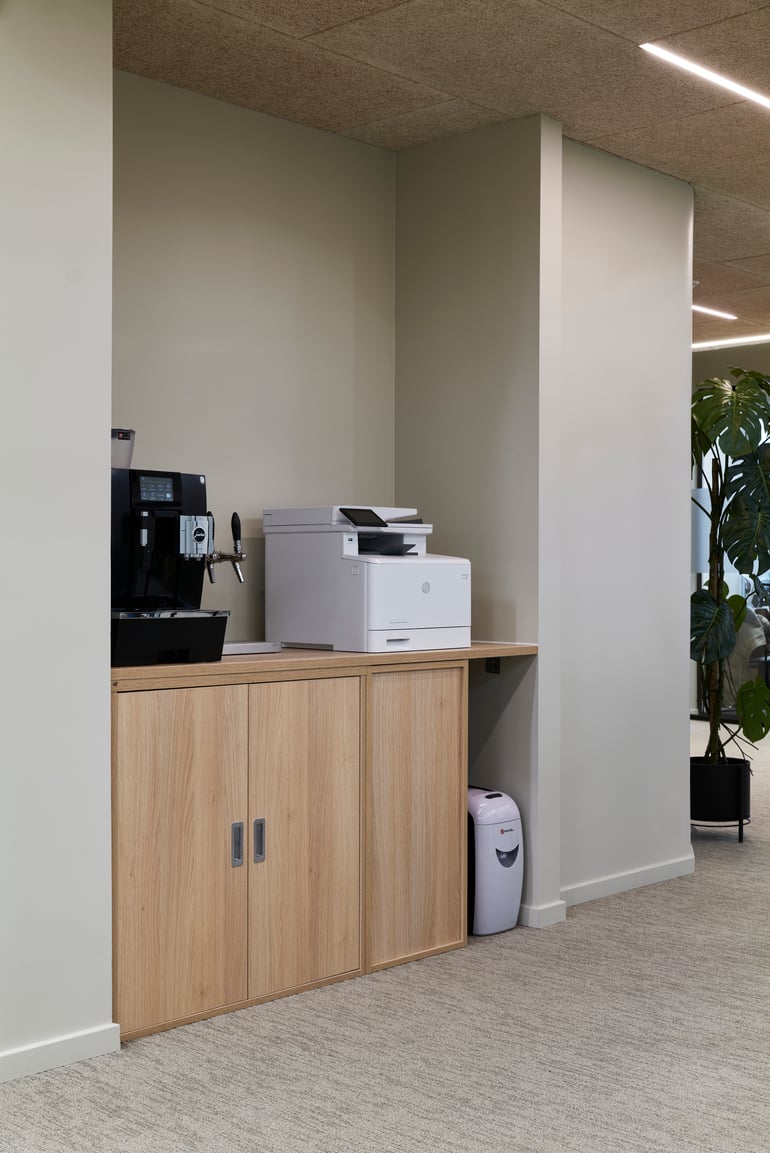 «Ved kaffemaskinen bygget våre montører en plasstilpasset løsning. De kappet en bordplaten på mål, deretter satt de inn et skap under bordplaten, og benyttet en MODULUS toppkasse for å skjule deler av åpningen» forklarer prosjektselger Maja.