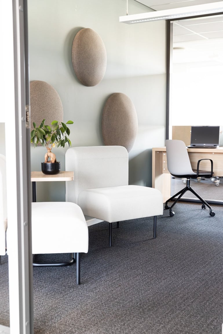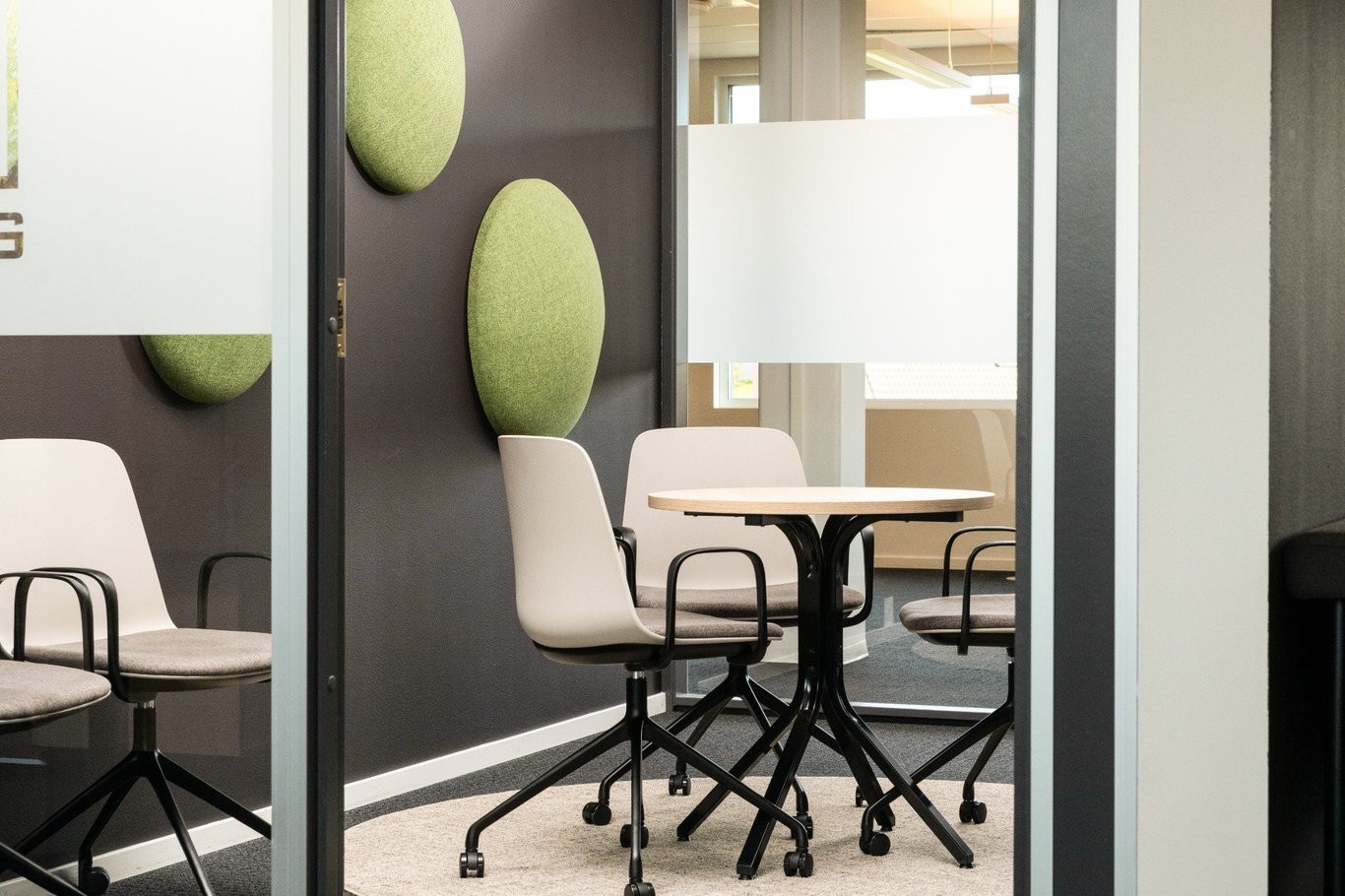 I tillegg til lokalets stilrene møterom, oppleves det åpne kontorlandskapet som varmt og omfavnende. Naturtoner i brunt og grønt rammer inn det hele. De ansattes skrivebord har bordskjermer. Skjermene fungerer som støydempere. En av de ansatte forteller at fargene gjør det behagelig å jobbe i lokalet.