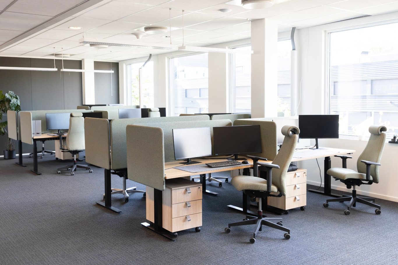 Alle møblene fra AJ har et ergonomisk utgangspunkt. Flere av dem er bevegelige og justerbare. Det gir mulighet for individuell tilpasning og mulighet for å variere arbeidsstillinger. – Vi ville ha et kontor hvor man kan bevege seg og bruke møblene. Det har AJ levert, forteller Lars.