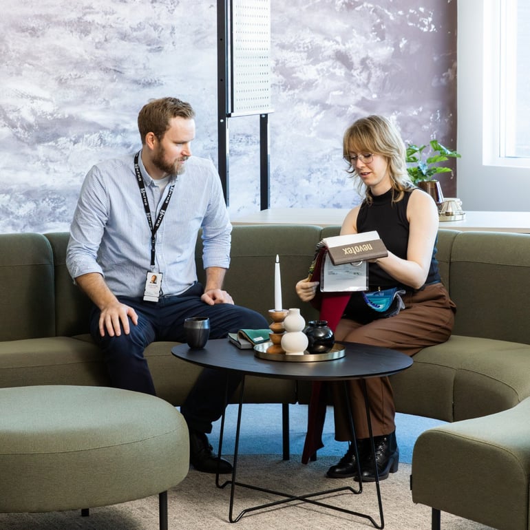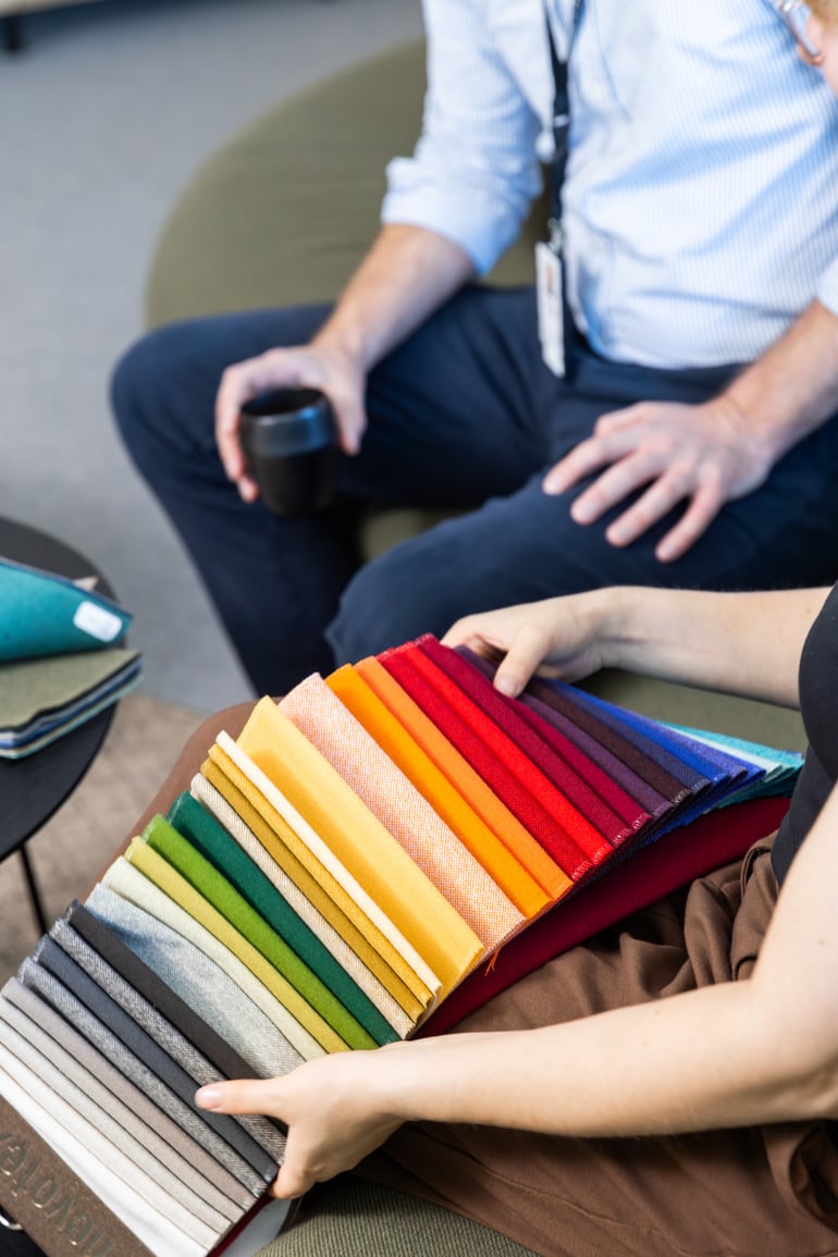 Maja forteller at hun har jobbet med å skape en helhet av farger og tekstiler, og dette fremhever Lars. – Helhetsinntrykket er bra, og det er fint å ta med kunder hit. De får et godt inntrykk av oss som selskap, sier han.
