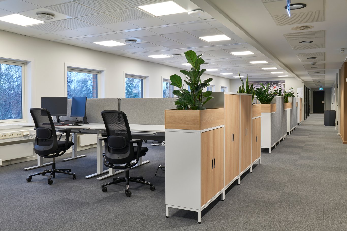 Kontorplasser til 46 ansatte ble satt sammen av hev- og senkbare skrivebord og oppbevaringsskap i MODULUS-serien, samt skjermveggen ZIP RIVET. Til møterom og stillerom ble konferansestolen FAIRFIELD valgt ut, og i fellesområder ble stolen GANDER og møbler i lounge-serien COPENHAGEN benyttet.